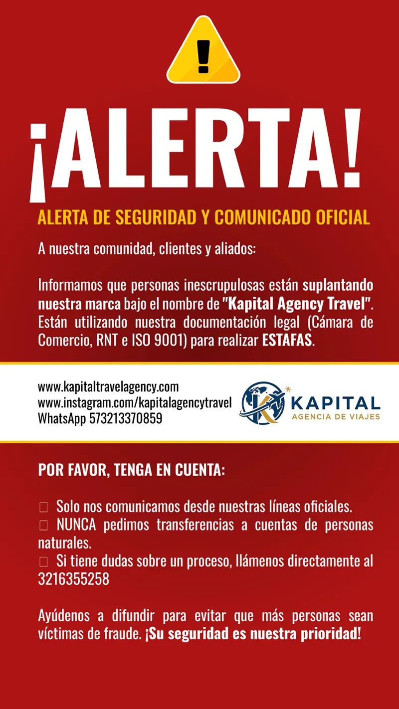 En Kapital International, Agencia de Viajes en Pereira, nos encargamos de presupuestar su paquete turístico en Colombia. Como agencia líder en el sector, contamos con sólidas alianzas a nivel mundial que nos permiten ofrecer los mejores paquetes turísticos todo incluido, garantizando así una experiencia libre de preocupaciones para nuestros clientes.
